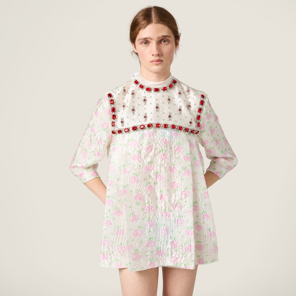 The full silhouette of this mini-dress is created by light silk duchesse fabric and organza lining. The puckered fabric with a delicate floral motif is enriched with an artisanal crystal embellishment that expresses femininity and sophistication.