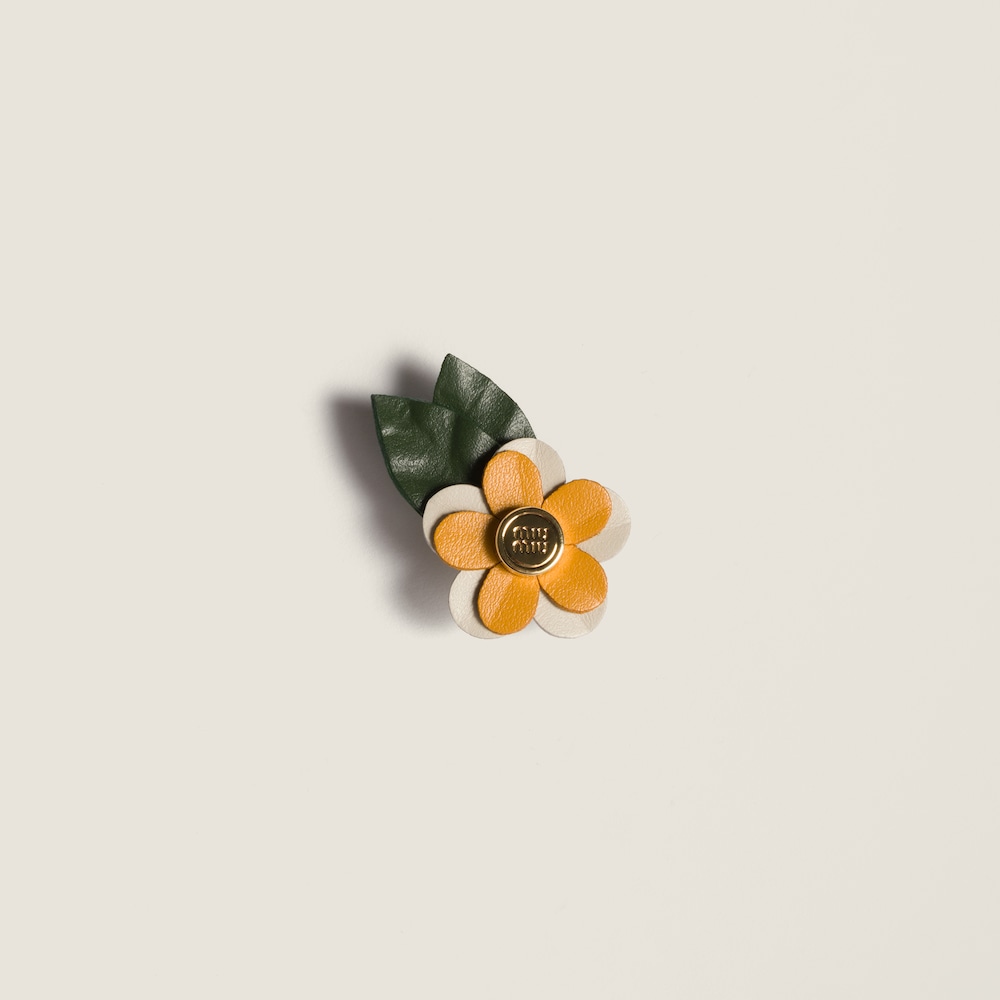 Miu Miu's bold, playful character comes to life in this floral-inspired brooch with metal logo that enriches the silhouette of sneakers and bags, creating unique style combinations.