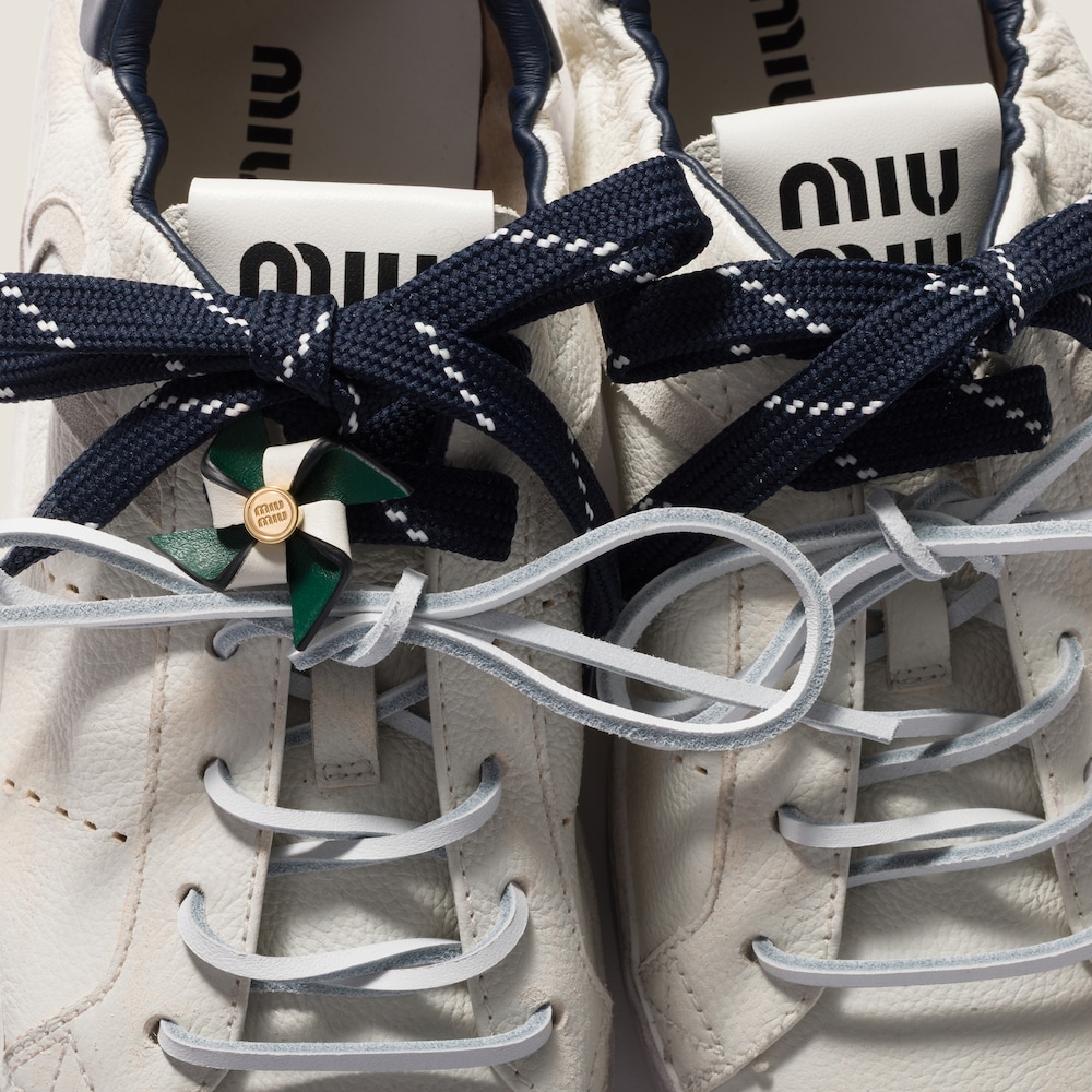 Miu Miu's bold, playful character comes to life in this pinwheel brooch made of two-tone leather with metal logo that enriches the silhouette of sneakers and bags, creating unique style combinations.