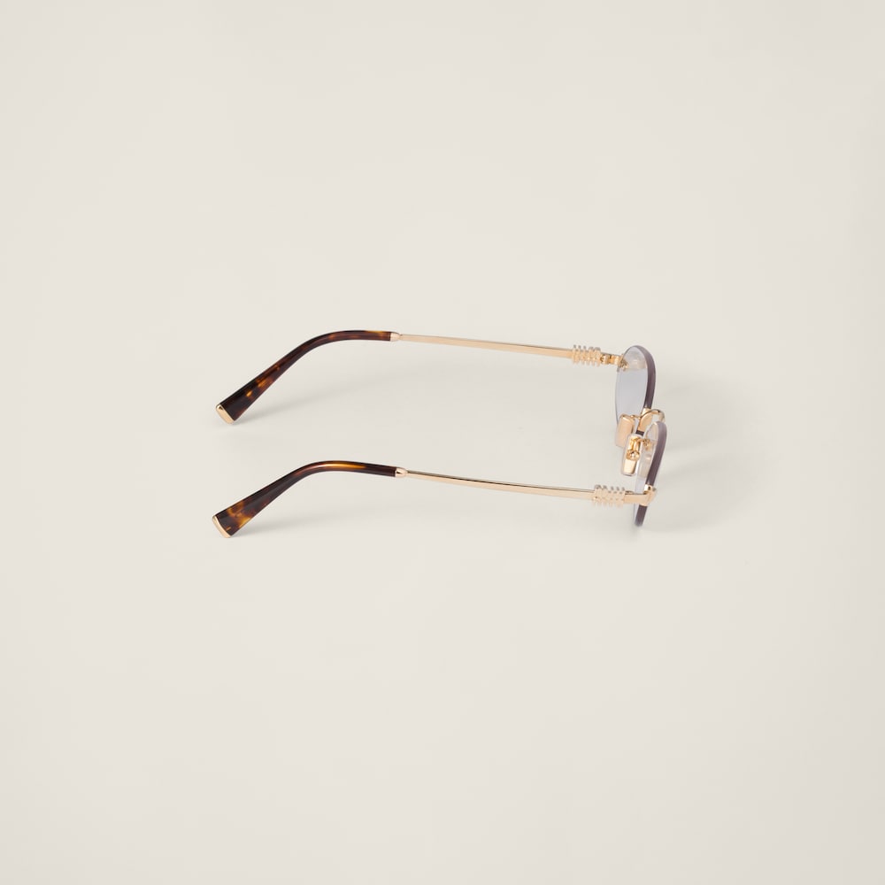 Classic and sophisticated attitudes blend together in these Miu Miu sunglasses. The ultra-light metal frame features rimless oval lenses enriched by a palette of playful shades. The vertical Miu Miu logo decorates the ultra-thin temples.