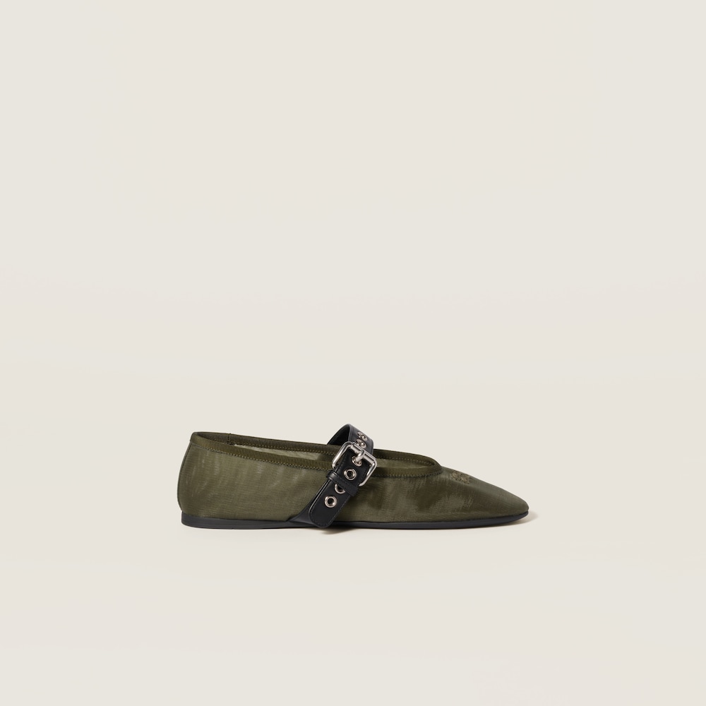 The iconic allure of the Miu Miu ballerina flat finds new expression in this summery mesh fabric version featuring an elegant texture and bold strap closure.