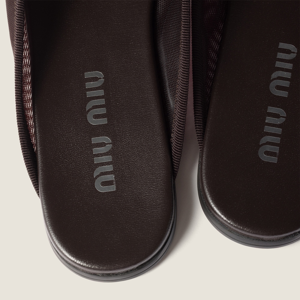 Inspired by the lightness of iconic ballerina flats, these mesh slippers reveal a simple silhouette with a delicate transparency, expressing Miu Miu's young and experimental spirit.