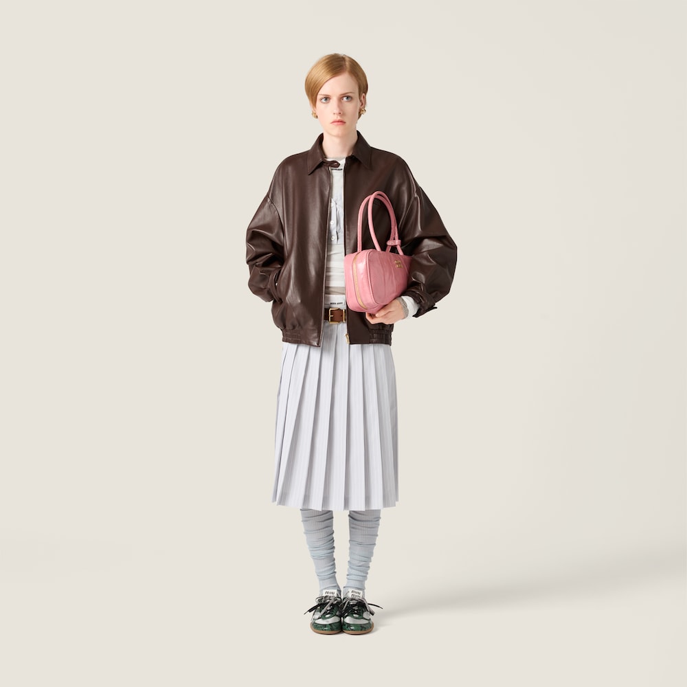 The soft touch of nappa leather enhances the silhouette of this blouson jacket inspired by classic looks and enriched by a slightly glossy, embroidered logo, revealing strong femininity.