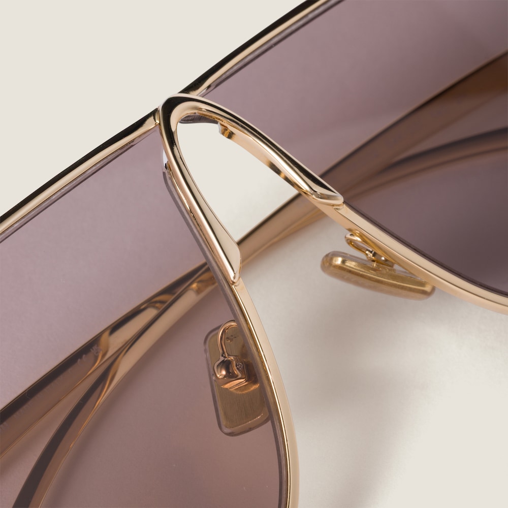 Oversized shapes and refined details blend together in the new edition of Miu Ombre sunglasses. The large metal frame features pilot lenses highlighted by the distinctive bridge design. The temples are decorated with the Miu Miu logo in a contrasting shade.