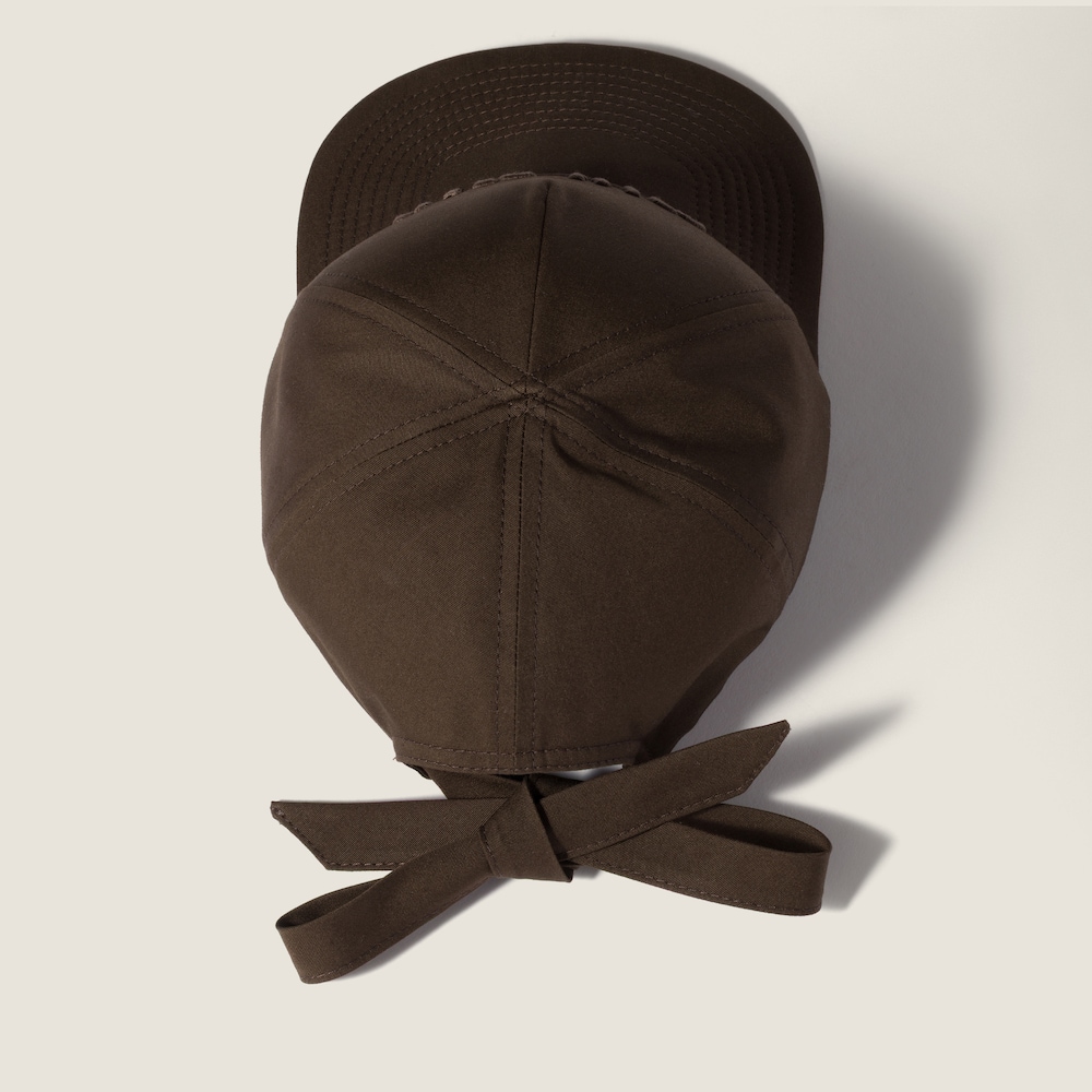 The iconic Miu Miu baseball cap is reinterpreted in the details of the tie closure on the back and the embroidered tonal logo, expressing an elegant character and versatile style.