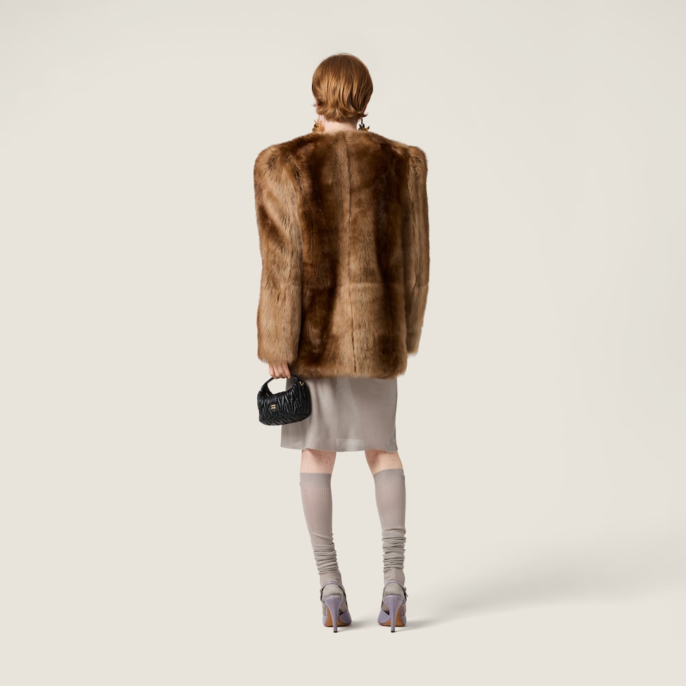 Vintage references define the character of this shearling jacket. The sophisticated volume of the luminous fur, along with the refined chromatic variations finished by hand, embodies new femininity suspended between irony and authentic bourgeois style.