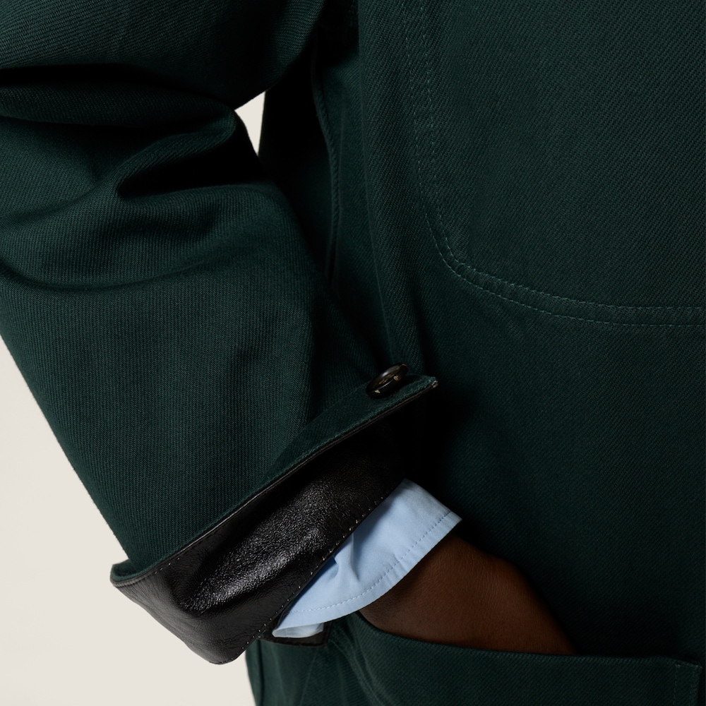 This jacket inspired by men's workwear expresses an authentic, vintage look thanks to durable, garment-dyed cotton gabardine with intense color. Leather details in a contrasting color add an unexpected, artisanal character.