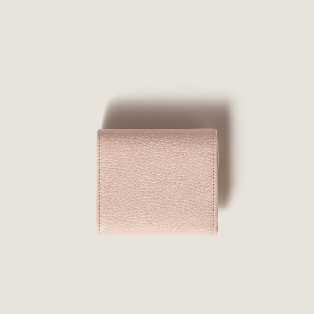 This wallet with a sleek shape and compact size stands out for the fine nappa leather craftsmanship and the iconic embossed Miu Miu logo, expressing bold and functional elegance.