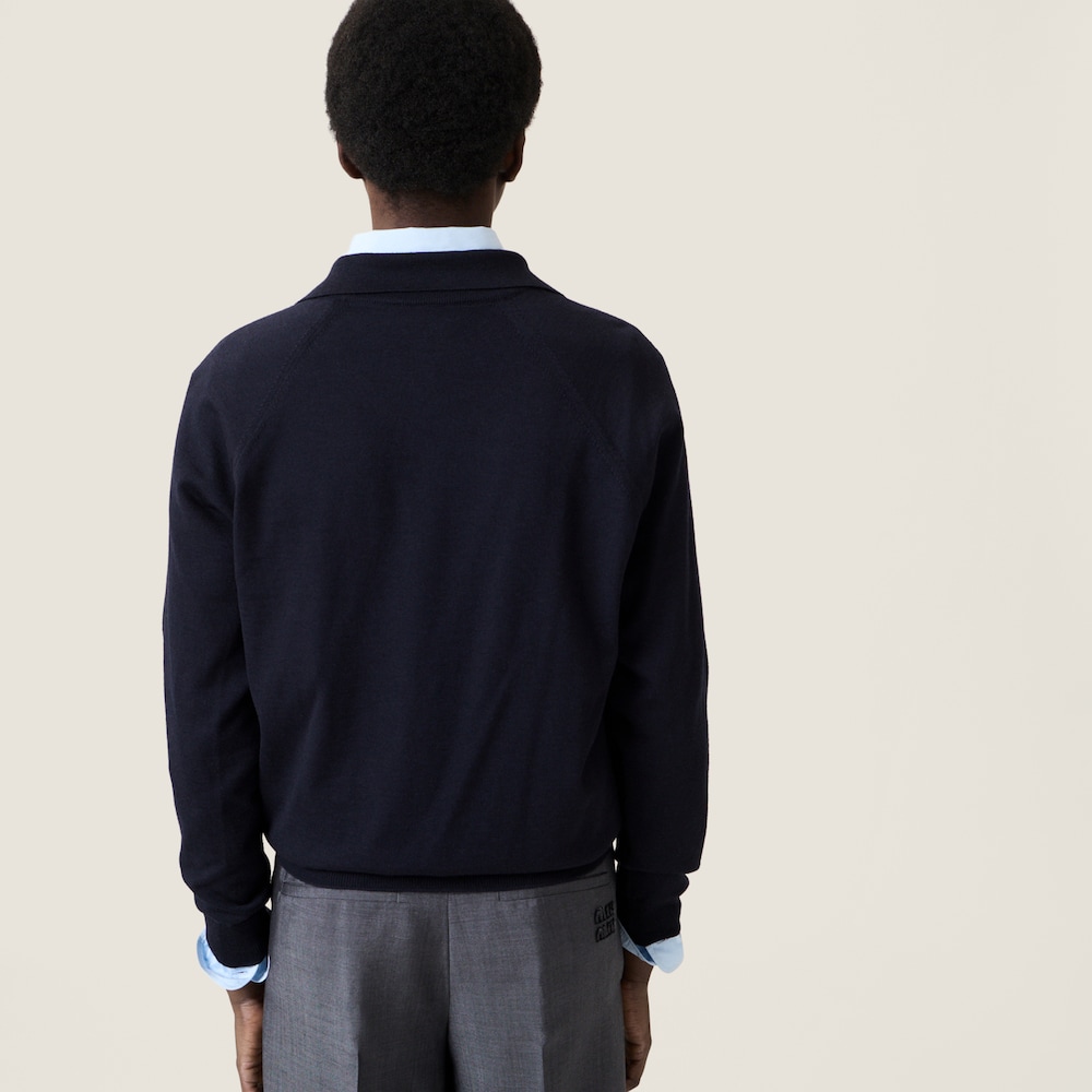 Very fine wool yarn defines the precious balance of this polo sweater that reinterprets classic Miu Miu codes through strong colors and the iconic intarsia logo in a contrasting shade.